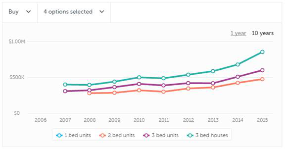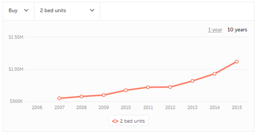悉尼17km以内很难找到$50万的两房,悉尼两房公寓均价已过百万澳币,2016年超过百万的区已多于65个,还有20个逼近百万大关。